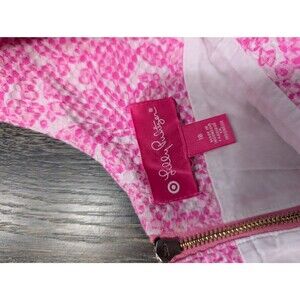 The Lilly Pulitzer for Target Dress is a stylish and vibrant option for women in size 18. This sleeveless shift dress in a pretty pink color features a floral pattern, scallop trim, and a V-neckline. Made from a blend of spandex and cotton, this short dress is perfect for summer and spring occasions, whether for a party or casual outing. The zip closure at the back makes it easy to put on and take off, adding to its convenience and comfort. Perfect for women looking for a chic and trendy piece to add to their wardrobe.
