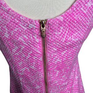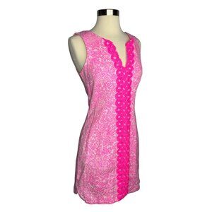 Keywords: Lilly Pulitzer dress, pink lace dress, cotton spandex blend, summer dress, pink outfit, lace trim dress, women's pink dress, lightweight dress, casual pink dress, textured sleeveless dress, pink sleeveless dress, Lilly Pulitzer Target, Lilly Pulitzer size 2, maximalist dress, colorful dress, pink barbie dress, shift dress, pink shift dress