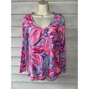 Lilly Pulitzer tablet protector bag in green and pink floral print. Features a print with pink flowers and green seahorses. On the bottom side, there is a pink brand label. Zipper tab is silver with a pink ribbon on it, and zipper itself is green to match the print. Main pocket zips closed. Lining is pink, and on the interior there is a small mesh open-style pocket designed for wireless earbuds. Bag is padded and fabric is smooth to keep devices safe. Bag is 8” left to right, and 10” top to bottom. EUC, no visible wear.