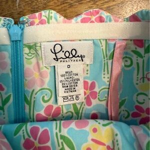 EUC size 0 Lilly Pulitzer strapless dress with scalloped neckline and grosgrain ribbon belt. Hidden rear zip. Blue with pink flowers and leopards
