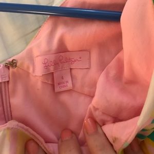 Lilly Pulitzer one shoulder dress size 4. Never worn but purchased on Poshmark. So stains on outside but few bronzer stains around the inside, can't be seen when wearing