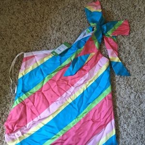 Sorry so wrinkled! But in perfect condition- new with tags. Such a fun colorful top. One shoulder with tie bow and not see through