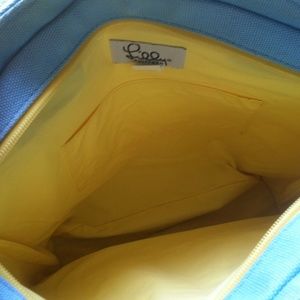 This is a light yellow canvas Lilly Pulitzer pocketbook with light blue bottom and trim... It shows some wear but could be cleaned up nice... As seen in one of the pictures the bottom has obviously been set down in some bleach or something that's has taken the color out
