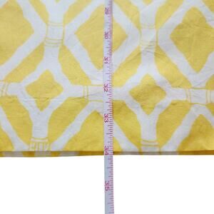 Lilly Pulitzer silk/cotton blend shift dress is yellow and white and features a bamboo print. Open weave lattice neckline, side zip, retro silhouette. Size 2, excellent pre-owned condition. Measurements in photos.