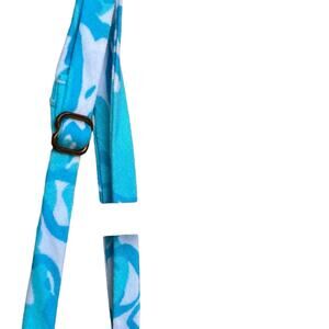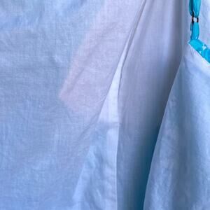Perfect for the summer the cotton dress features a turquoise blue and bright white. It has a zipper in the back and it also has padding and adjustable straps. The sheer stripes at the bottom, add a touch of class and style.  The dress is lined and has no flaws.
