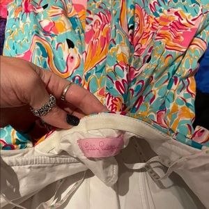 Strapless Lilly Pulitzer dress zips on side has a cute little tie in the back I was never able to wear it it was a gift very excellent used condition like new very colorful I forget the name of the line but has flamingos very very cute on material is not super soft but very comfortable. Would say it would fit a size 00-2
