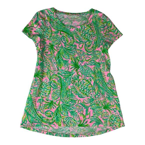 Lilly Pulitzer short sleeve shirt. Size extra small. Pima Cotton. Eye-catching short sleeve tee with tropical print. Features vivid pink and green design. Ideal for casual wear.