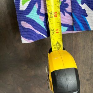 The color is blue, purple, green, and white tropical floral print with gold brocade