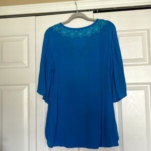 Lilly Pulitzer blue tunic with turquoise embroidered neckline. 3/4 length bell sleeves.
