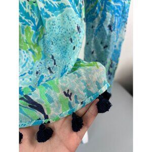 Lilly Pulitzer brand women's 1 size blue spa let's Cha Cha murfee scarf. Brand new with tags, only flaw is a couple of spots with the threads separated leaving gaps, can't really be seen when worn. Beautiful blue spa coloring with the Let's Cha Cha print. Silk and cashmere material is lightweight with a great flow. Has cute tassels on the ends.