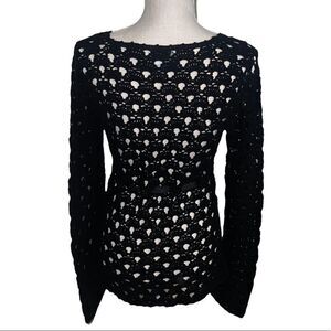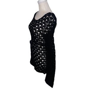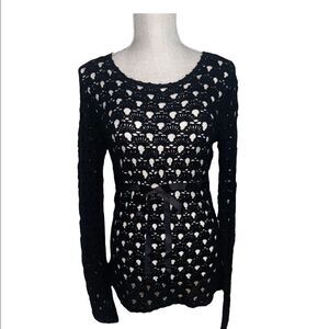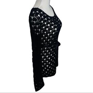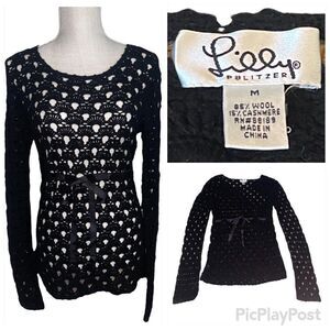 Lilly Pulitzer Crochet Top with Tie Waist. Size medium. This is a classic, beautiful cashmere wool blend sweater on the softer side. Open weave crochet w/ a black velvet removable ribbon tie waste! Thread the ribbon easily through the weave of the crochet or wear it loosely tied or not at all - completely removable! Sweater has some stretch. Unlined.
