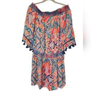 Lilly Pulitzer "Joelle" Off The Shoulder Tunic Dress, Printed Smocked 'Solar Opposite' Pattern | L | EUC | MSRP $178 | Measurements Laying Flat and Unstretched: Pit to pit 19" | Length 34" | Sleeve Length 13" | Smocked Waist 16"