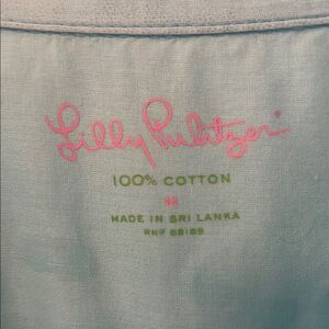 Preowned in great shape, super light weight. Elegant light blue shirt by Lilly Pulitzer. Made from 100% cotton. Features signature branding.