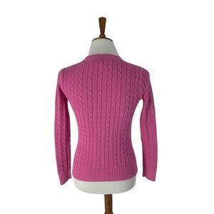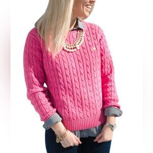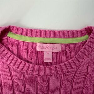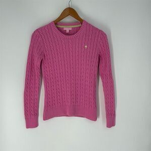 This Lilly Pulitzer pullover sweater is designed for women and features a solid pink color with a cable-knit style. Made from cotton, it has a crew neck and long sleeves. The sweater includes a cable knit design and logo embroidery, offering a casual and preppy theme. It is machine washable and fits regularly. Ideal for casual occasions, this sweater can be worn for a relaxed day out or a cozy gathering. The item is pre-owned.