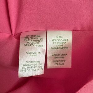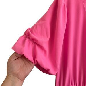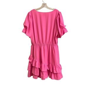Hot pink short sleeve dress. Puff sleeves. V-neck. Elastic close at waist. Ruffle hem. Has belt loops. Belt not included.