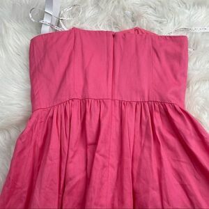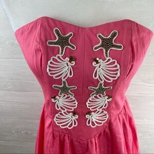 Lilly Pulitzer Mayfield Seeing Stars dress size 2. Pink/coral cotton material with multicolor beading. Lightly boned bodice with crochet and beaded ocean accents. Discreet back zipper closure and fully lined. Interior lace detail hemline. No holes or stains.
