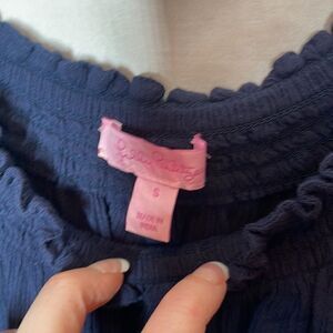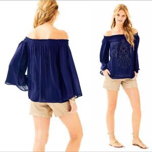 Lilly Pulitzer Nita Navy Off The Shoulder Embellished Top. Size Small. Smocked neckline. Embellished and embroidered front. Excellent condition.