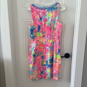 EUC- This stunning sleeveless mini dress by Lilly Pulitzer features a vibrant pink and blue color palette, perfect for resort wear. The v-neck adds a touch of elegance to the sheath style, making it ideal for cocktail occasions. Its artistic design captures the essence of tropical fashion with a modern twist. It is fully lined, has a hidden back zipper and no pockets.