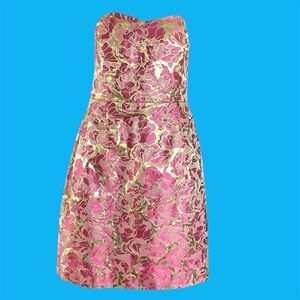 Lilly Pulitzer RAYA Strapless Dress Metallic Multi Pirates Bootyniere Jacquard, Pink Gold