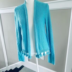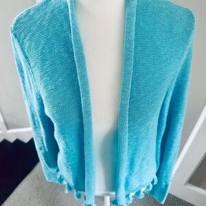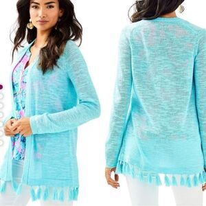 Elegant Sea-salt blue, light knit sweater by Lilly Pulitzer that is ideal for cozy layering. Featuring an open front, with fringe detail on hem. Cotton and Acrylic blend. L 19” x W 17” pit to pit.