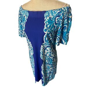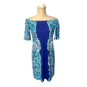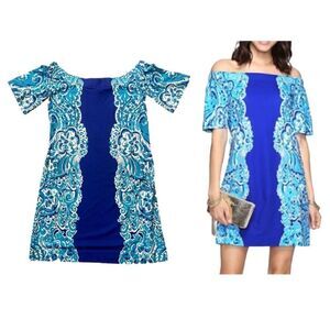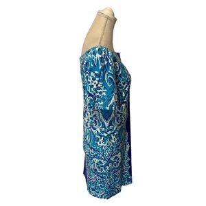 Lilly Pulitzer Tiana Dress in Brilliant Blue Moon Jellies Print. Gorgeous print with a summer coastal beach ready vibe! Features elastic trim that can be worn both on or off shoulders. Unlined. Lighter weight cotton. Hand wash. Measurements in pictures. Bust 16”; waist 16.5”; hips 19”, length 30”.