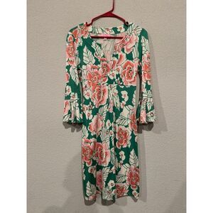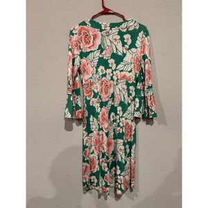This vibrant multicolor knee-length dress features a signature bold floral print with pink and coral blooms against a green backdrop. Designed with comfortable three-quarter sleeves accented by playful ruffled cuffs and a flattering V-neckline, this casual knit dress offers effortless warm-weather style. Perfect for adding a cheerful touch to any sunny occasion.