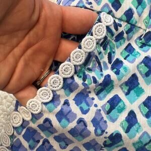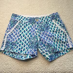 Lilly Pultizer Callahan Shorts PIneapple Blue Resort White Embroidered Short 0. Preowned and excellent condition. Embroidery along pocket hem. Callahan short with 5" inseam, blues, green and white coloring. Please see all photos. Approx measurements in pictures.