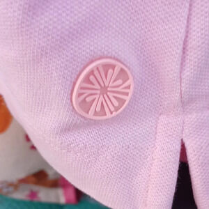 A soft pastel pink button down shirt with a classic polo collar and short sleeves, featuring a fitted style.
