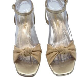 Pre-owned without tags or box Lilly Pultzer Emmie Wedge Sandals, Natural/Gold Women's 8.5M. These tan/gold wedge feature tie detail over the tow area for a touch of elegance. The open-toe design and ankle strap with buckle closure add to their feminine appeal, making them a stylist choice for any occasion.