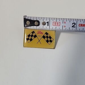 Gold rectangular pin featuring checkered flags and 'Lilly 1997' text.