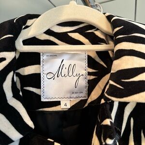 Stylish zebra print jacket from Milly of New York City. Features a bold black and white pattern. Perfect for adding flair to any outfit. In practically brand new condition.