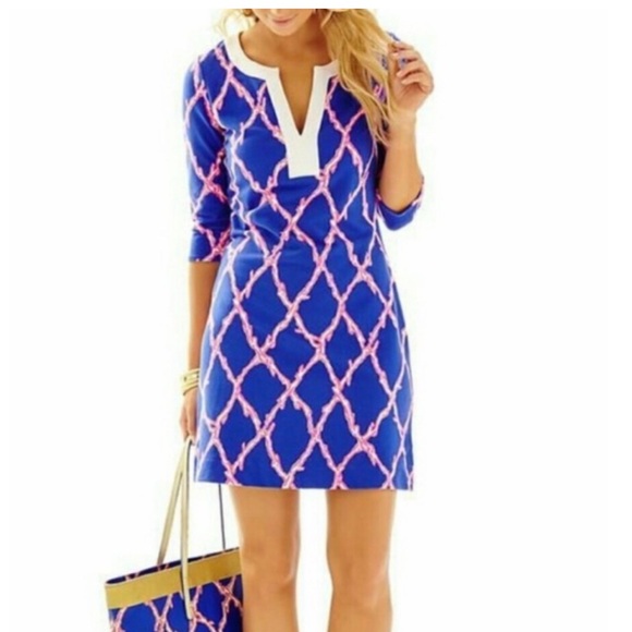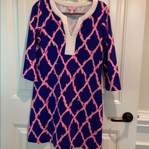 Lilly nautical print dress in thicker stretchy cotton with 3/4 length sleeves