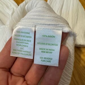 The Lilly Pulitzer Dahle Gauze Embroidered Tunic Top in women's size small is a stylish and comfortable piece perfect for a beach vacation. Made of rayon fabric, this V-neck top features a pullover closure and a tropical embroidered pattern. The tunic style is versatile for summer, fall, and spring, and the white color with coastal character makes it a chic addition to any wardrobe. With a band collar and dolman sleeves, this Lilly Pulitzer top combines easy care and contrasting trim for a casual yet elegant look.