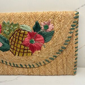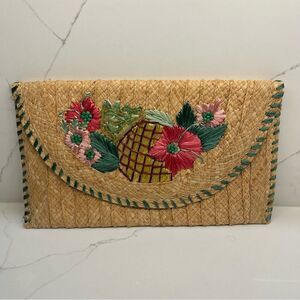 Stylish tan clutch with vibrant pink and green floral embroidery. Features a unique pineapple design. Perfect for any occasion.