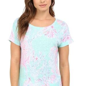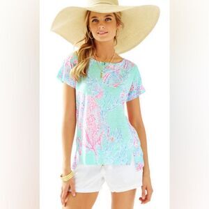 Stylish women's top in a refreshing aqua and pink design. Perfect for your summer vacation! Featuring images of coral and sea urchins.