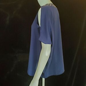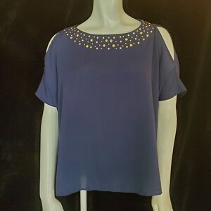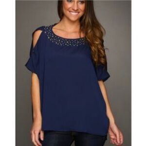Lilly Pulitzer navy blue cold shoulder blouse with gold rounded studs around the neckline.