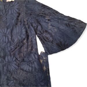 Bell lace sleeves accent the navy allover lace romper that looks like a mini dress.