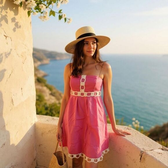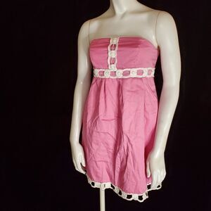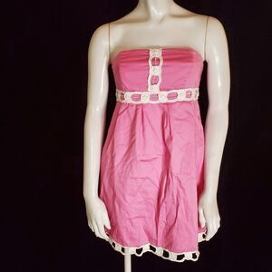Lilly Pulitzer pink strapless dress with white accents.