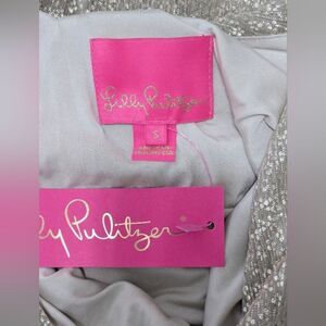 Description: Lilly Pulitzer Ruffle Gold Metallic Maximalist Boho Feminine Chic Cocktail Dress Faye V-Neck NWT S, sleeveless silhouette, fitted waistband, flowy, romantic ruffles wtih metallic sheen all-over, lined
