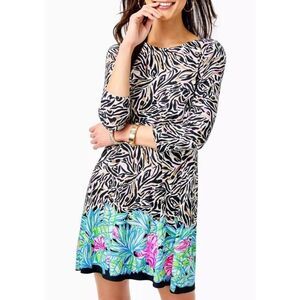 Introducing the Lilly Pulitzer Onyx Zebras Can You Zee Me Opelia Dress! This stunning dress features a colorful animal print pattern with a boat neckline and 3/4 straight sleeves. The pullover closure adds to the casual look, making it perfect for any occasion.