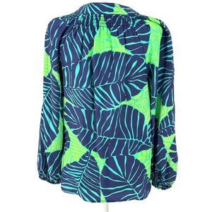 Step into bold style with this vibrant Lilly Pulitzer blouse in size XXS. Made of 100% silk, this luxurious top features a lush tropical leaf print in navy, green, and turquoise hues. The flattering split neckline with gold button detailing, gathered shoulder smocking, and blouson sleeves with elastic cuffs add both comfort and elevated style.