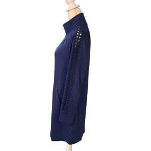 This Lilly Pulitzer dress features a sleek navy design with intricate lace accents on the sleeves and a functional half-zip neckline, offering both style and versatility.