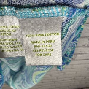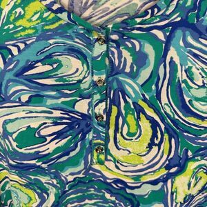 This is an eye-catching scoopneck pullover shirt from Lilly Pulitzer in hues from the ocean. The print is designed to look like oysters but the colors say otherwise. Beautiful teal and blue colors to brighten up anyone’s day. Super comfortable and easy.