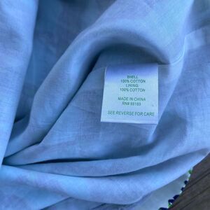 Blue strapless dress with white, green & navy macrame print & tassels along hemline. Lined. Back zip. Boning. Silicone strip around inside to keep top secure. Style# 17981