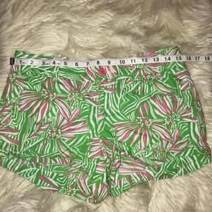 Good, preloved condition. Lilly Pulitzer Walsh Shorts in Green Bean. Shades of green, pink, and white. Floral print. Typical signs of wear. No holes or stains.