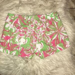Good, preloved condition. Lilly Pulitzer Liza Shorts. Hotty Pink Forgot my Trunks. Shades of pink and green. Lace crochet accents. Elephant and flower design. Typical signs of wear. Initials on the inside tag.