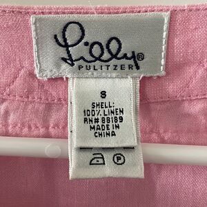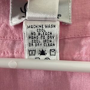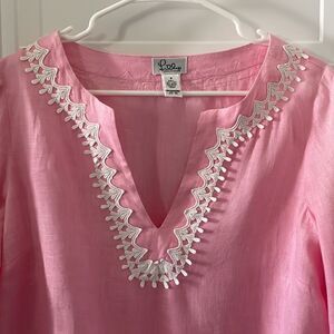 EUC- like new, white embroidery around the v-neck, cuffs and hem on pink linen fabric. There is a tie in the front to cinch as you wish.