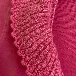 Pink cascading cardigan sweater. Ruffles have metallic sheen. Very small spot on back of arm, as shown. Hook & eye closure in front.