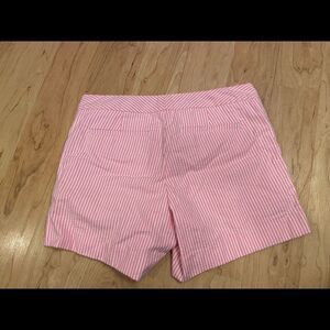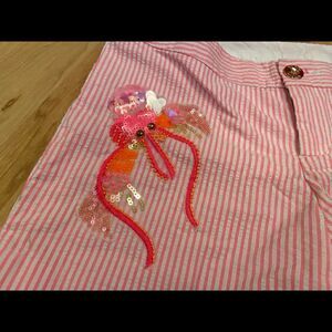 Lilly Pulitzer Pink stripe hermit crab sequin shorts. Pink/white vertical stripes. Embroidered detail, sequins, beads. 2 fake pockets in back. Gold Lily Pulitzer button. Size 0. Great condition!