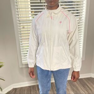 Lilly Pulitzer beautiful white jacket with pink piping, zipper pull & signature palm tree on front, mesh interior, elastic drawstring (with locking mechanism) in waistband, windbreaker like outer shell, great condition, HTF.